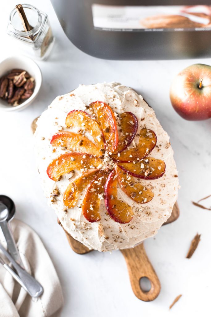 - Fold in apple pieces and pour mixture into breadpan. Smooth the top of your mixture.