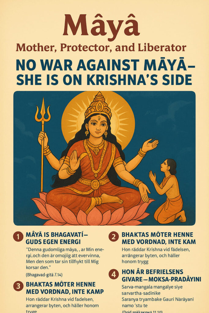 Många säger idag: “War against Māyā!”. Men i skrifterna är detta helt fel väg. Māyā är inte fiende – hon är Bhagavatī, Guds egen energi. Som Krishna säger i Bhagavad-gītā 7.14: